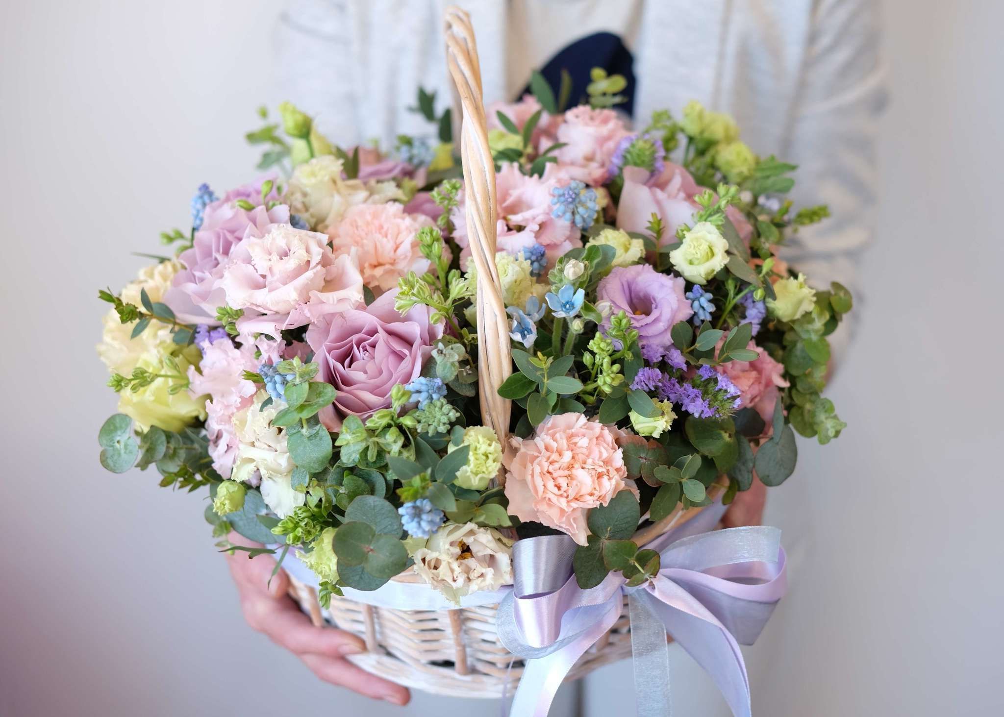 Двадцать пять французских роз в корзине создают плавный переход от светлых розовых тонов к насыщенной фуксии. Эвкалипт добавляет свежести и завершает композицию естественной зеленью. Букет удобно разместить на столе или комоде благодаря устойчивой корзине.