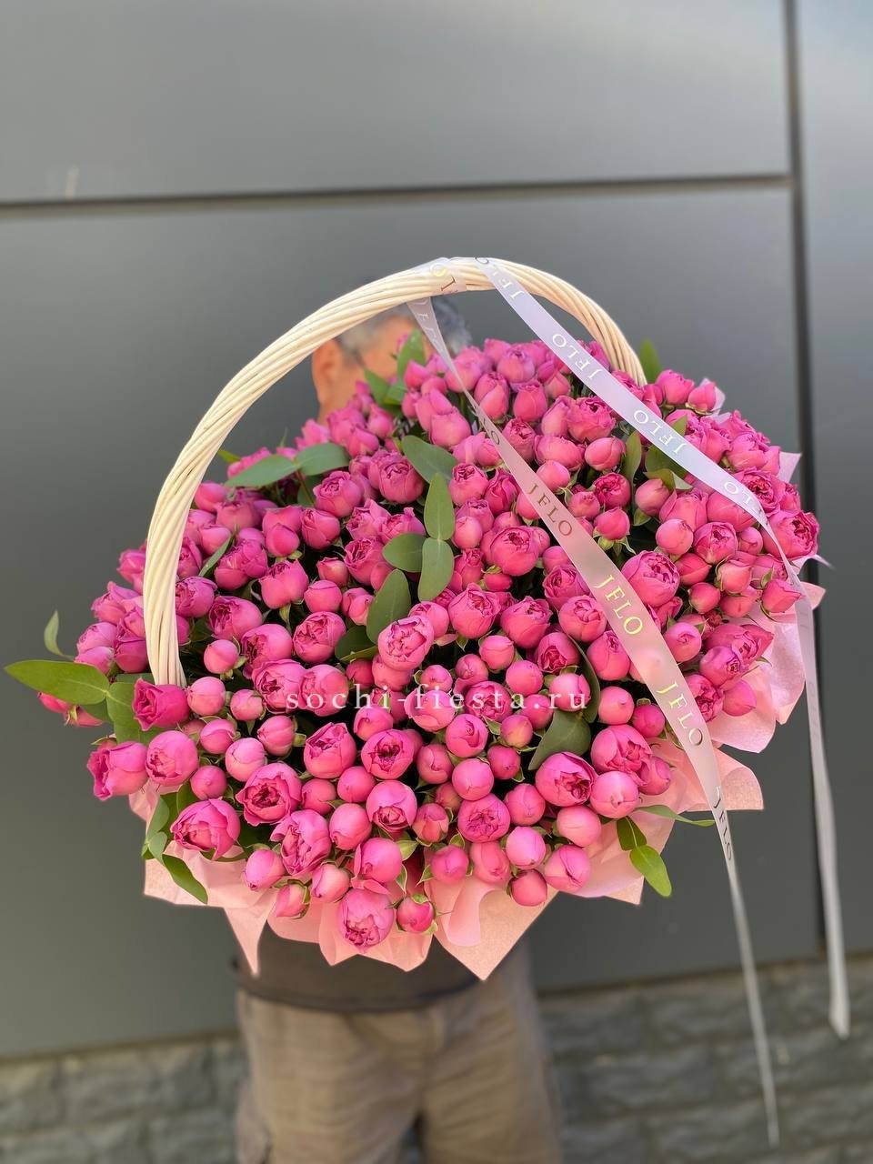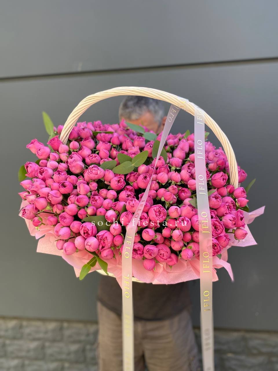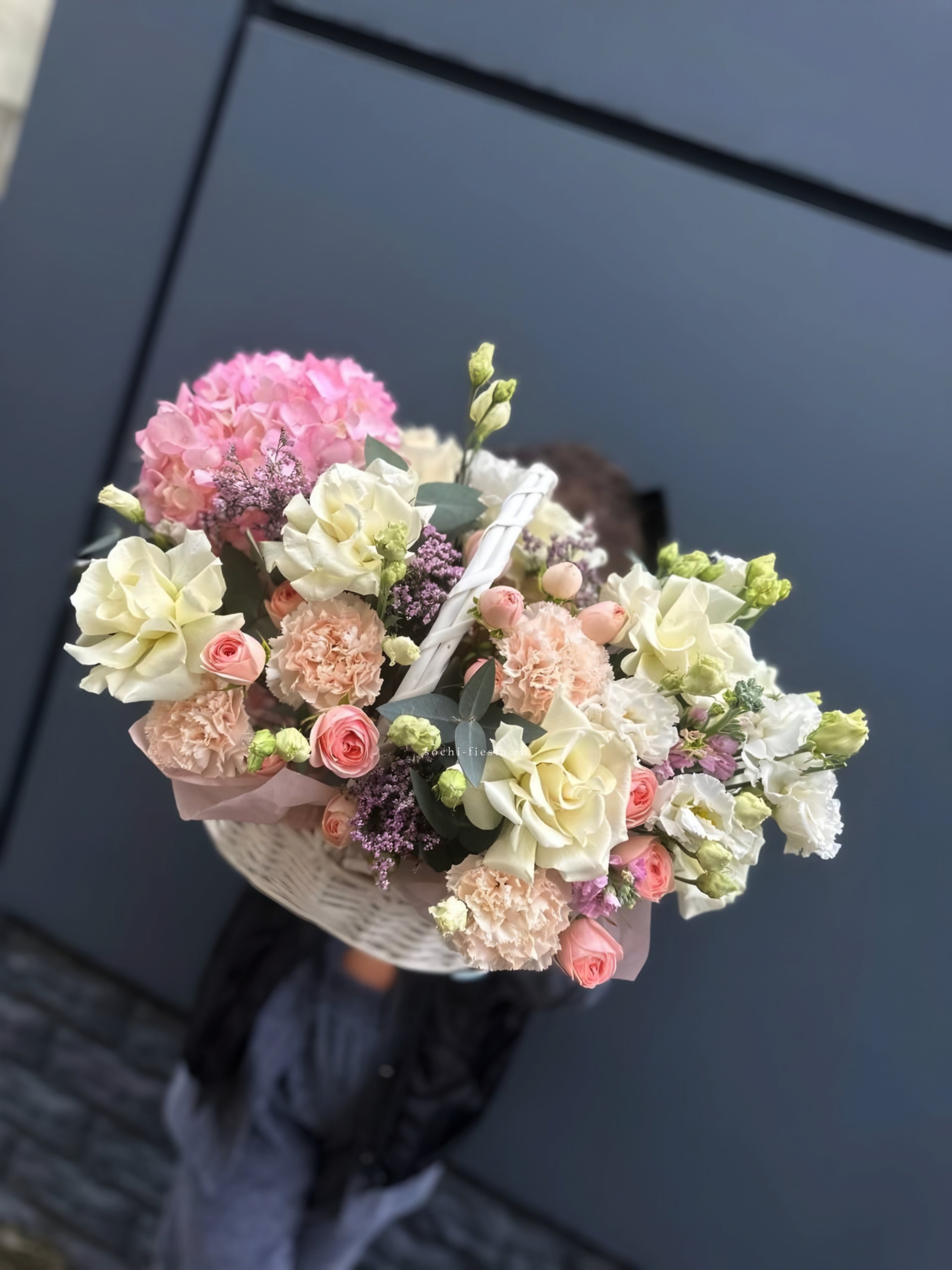 Гортензия и эустома задают объём, а яркие герберы расставляют цветовые акценты по всей композиции. Диантус и хайди добавляют воздушности, эвкалипт завершает силуэт мягкими линиями. Корзина держит форму и создаёт устойчивую основу для пышной композиции.