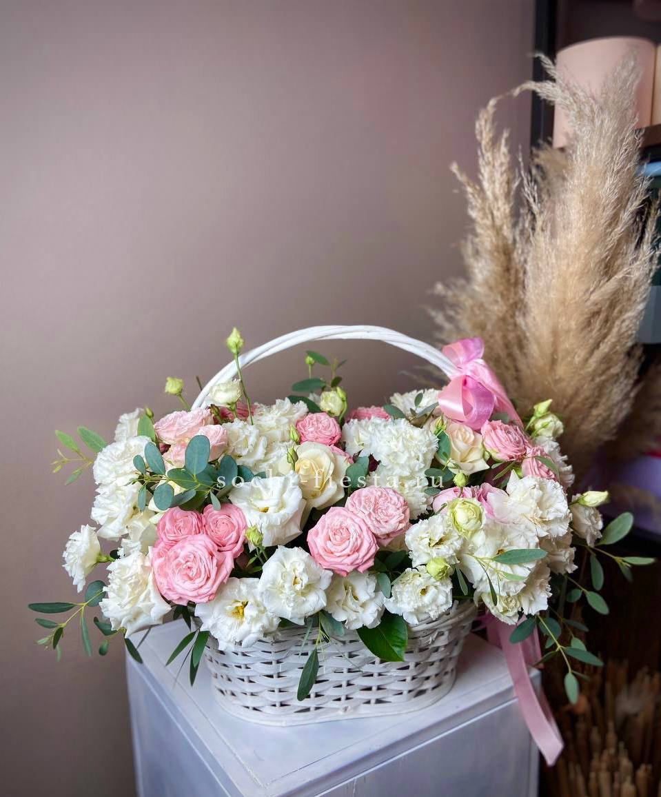 Диантусы создают воздушную текстуру, розы добавляют объем, а эустома раскрывается мягкими волнами. Композиция собрана в корзине и держит форму без лишних деталей.