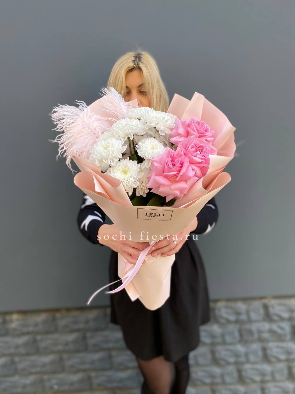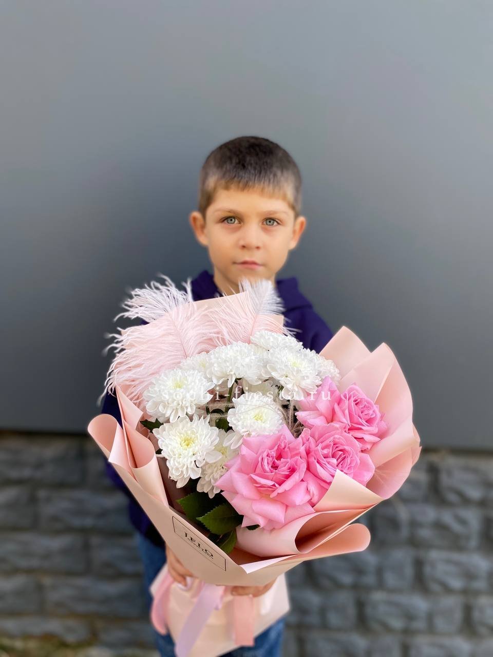 Компактная композиция с живым характером. Розовые розы и пушистая кустовая хризантема собраны плотно, а перо и ковыль придают букету лёгкую небрежность и естественный ритм.