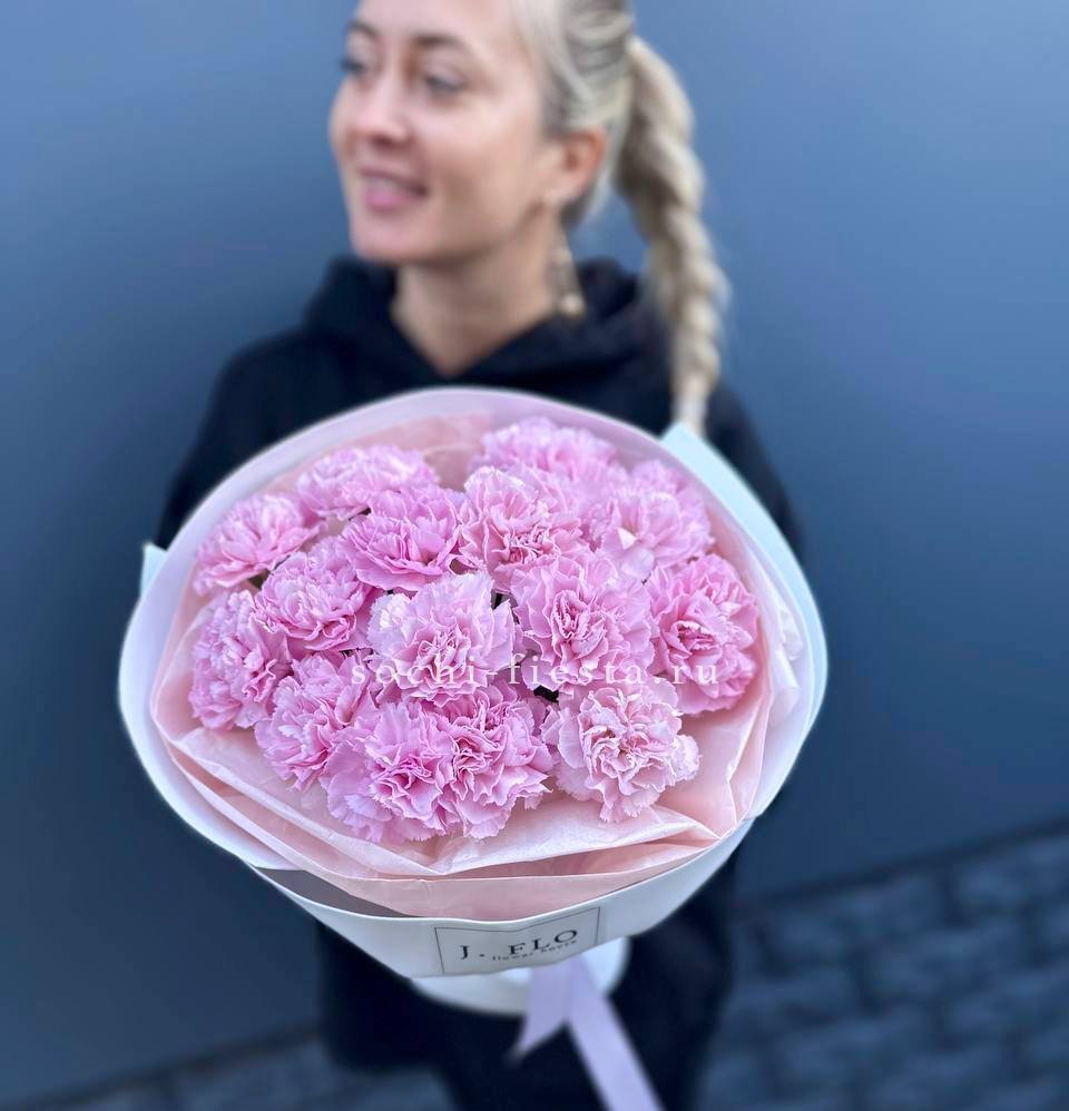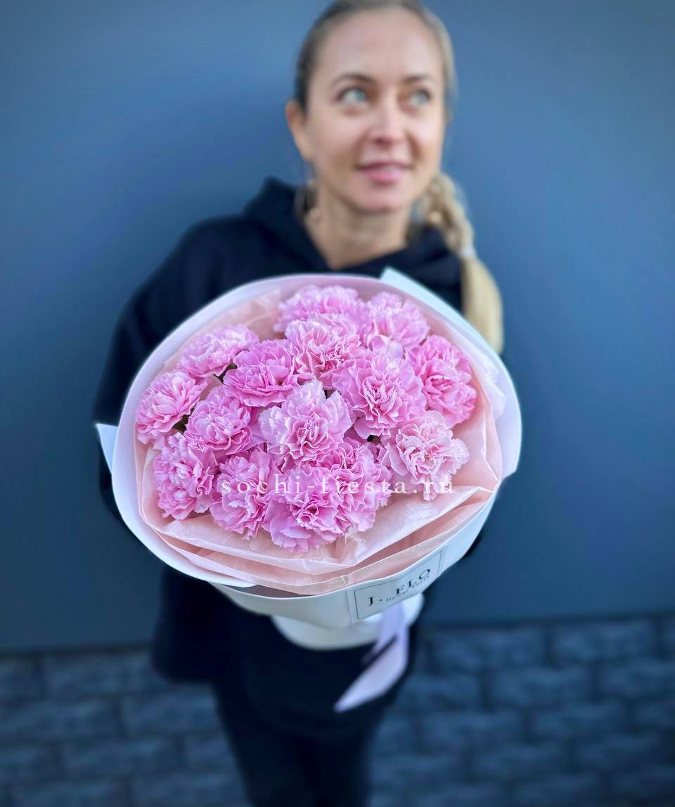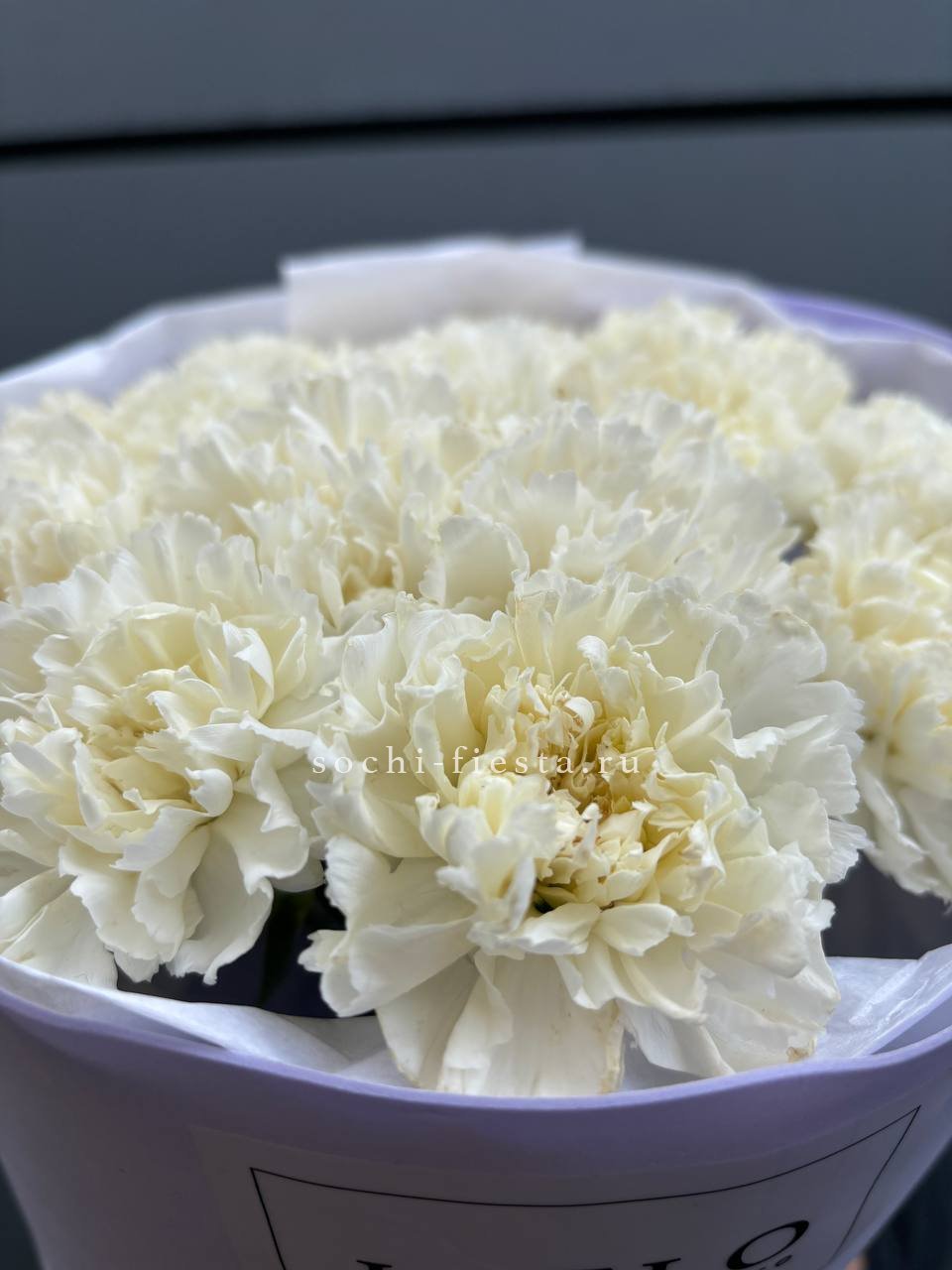 Диантусы с их густыми бутонами и резной формой лепестков выглядят графично и современно. Белый цвет усиливает архитектурность линий и создаёт чёткий визуальный ритм.