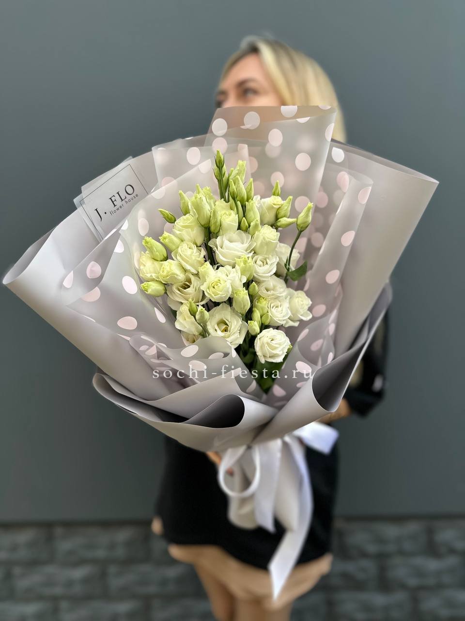 Двадцать одна эустома в дизайнерской упаковке с лентой. Бутоны разной степени раскрытия складываются в богатую текстуру и объёмный силуэт. Букет для выразительного жеста без лишних слов.