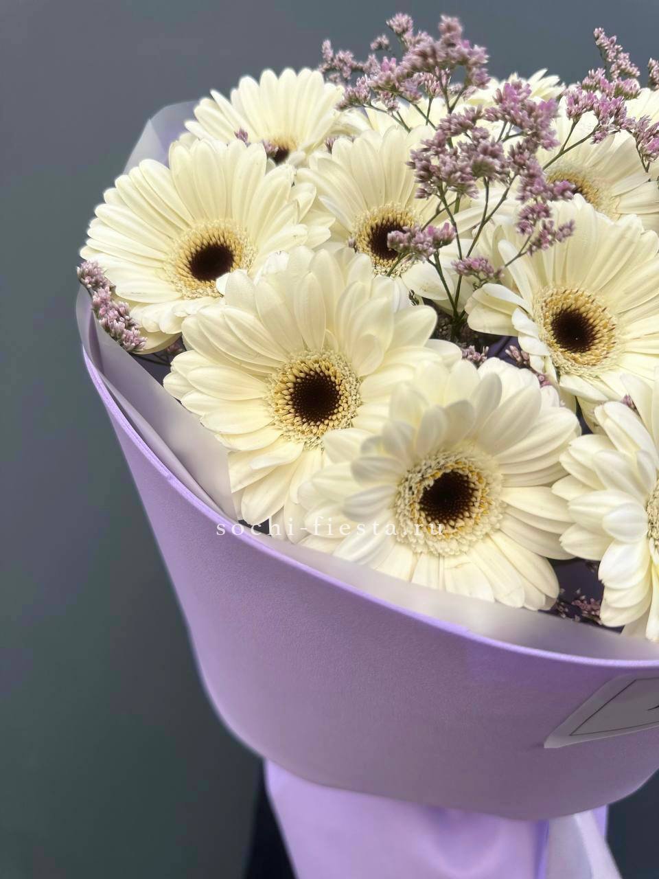 Голландские герберы сорта Solare дополнены воздушным лимониумом, который создаёт лёгкую дымку вокруг ярких головок. Дизайнерская упаковка завершает композицию, удобную для размещения в любом интерьере.