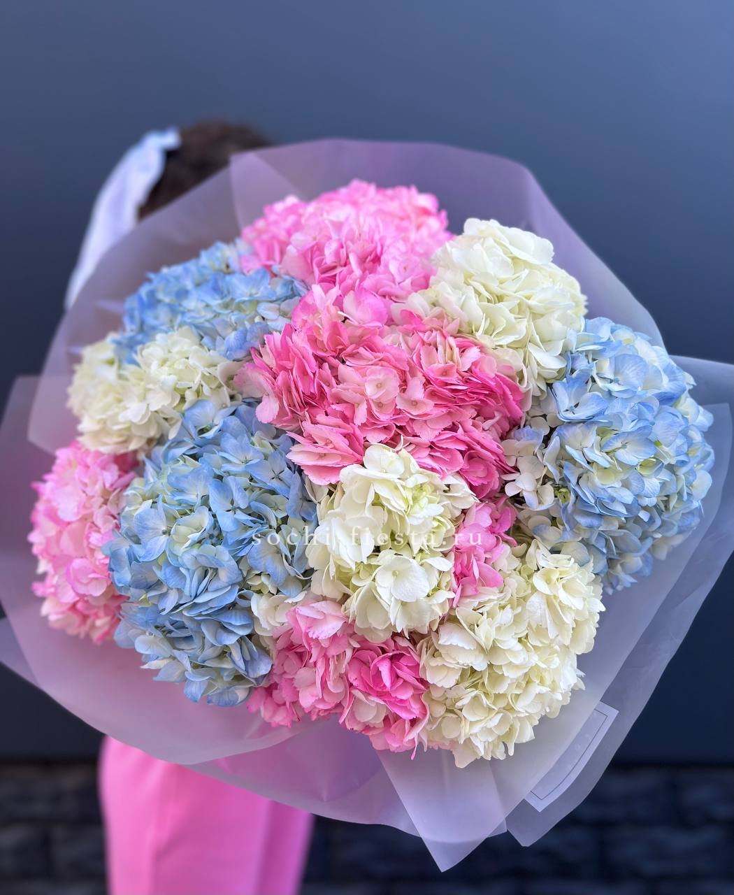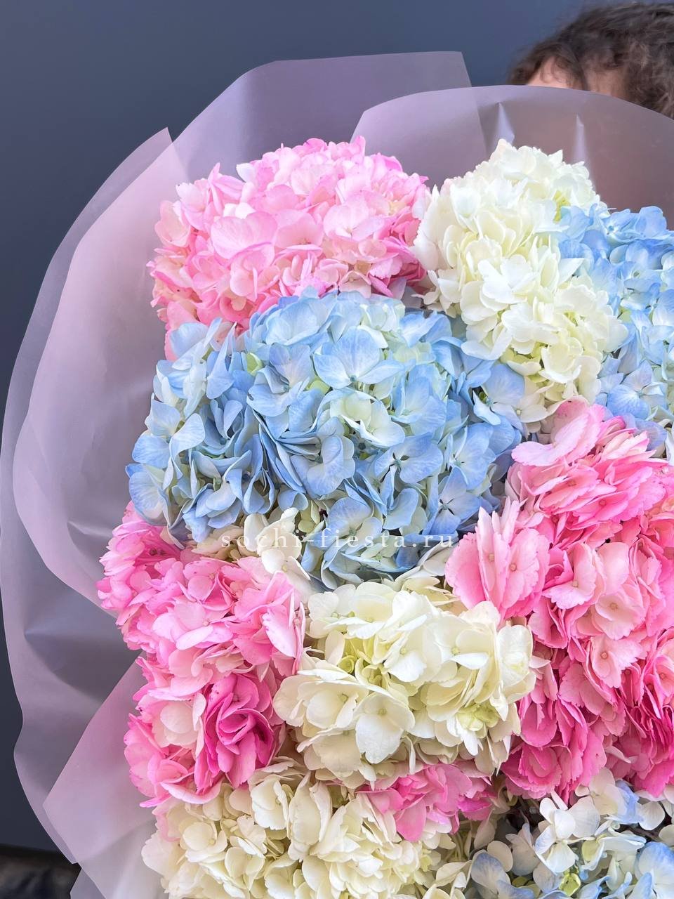 Пять соцветий гортензии в оригинальной упаковке-пиджачке. Необычная форма подачи превращает классический монобукет в яркий акцент для торжественного момента.