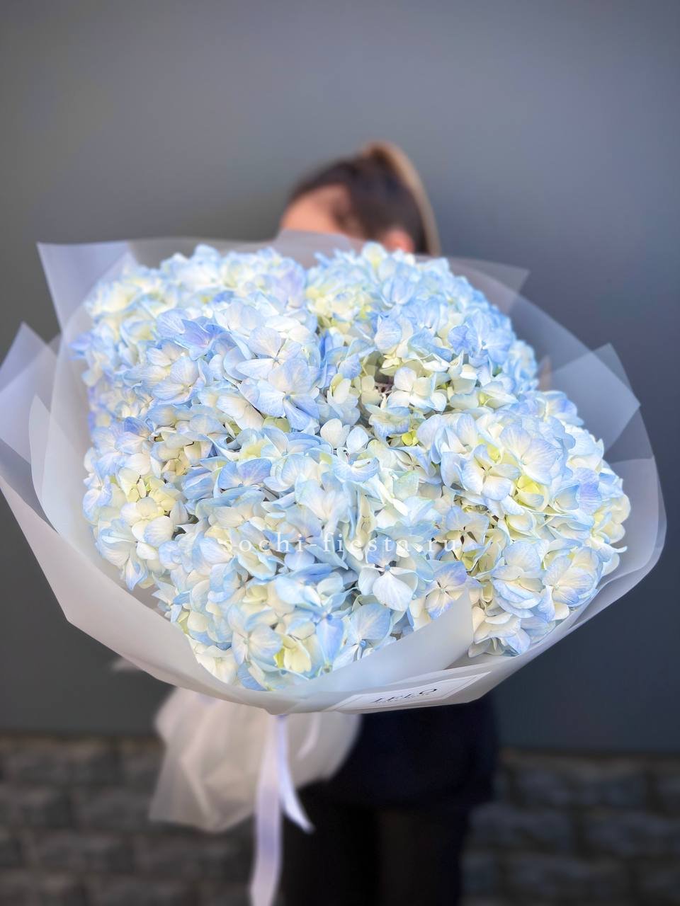 Воздушные шапки соцветий собраны в пышную охапку белоснежного цвета. Гортензия создаёт объёмную текстуру и заполняет пространство мягким природным светом. Букет для тех, кто ценит чистоту линий и естественную красоту.