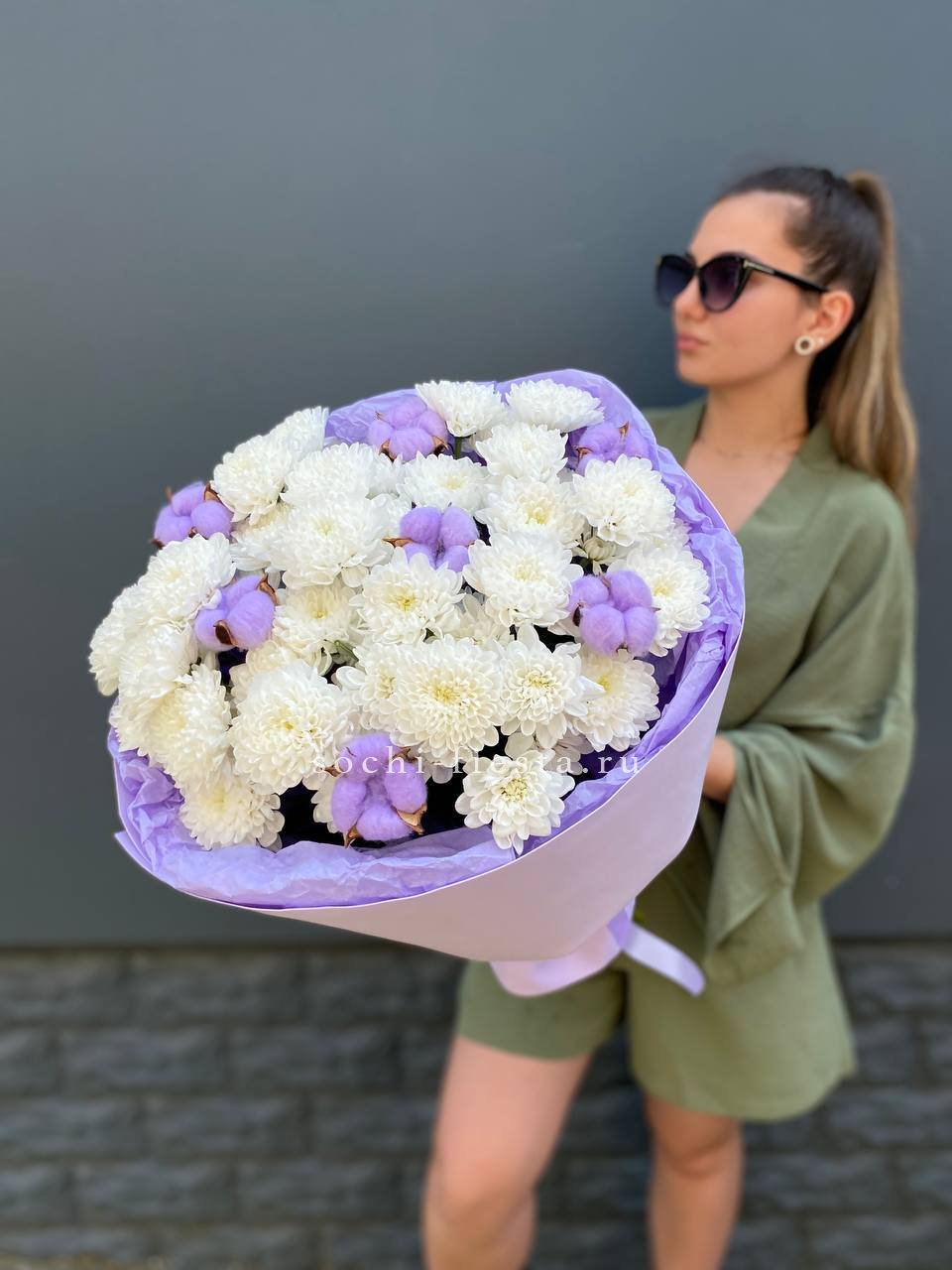 Для заказа товара " Букет хризантем и хлопка" с доставкой в Шахтах нажмите в корзину