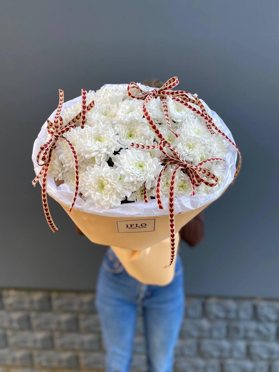 Семь хризантем собраны в плотную округлую форму и украшены бежевой упаковкой с тремя тонкими бантами. Сердечки на лентах добавляют композиции трогательности. Букет держит форму и выглядит аккуратно в руках или в вазе.