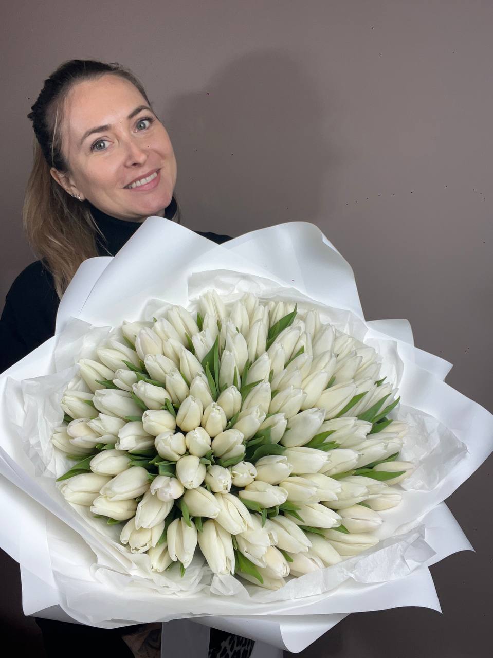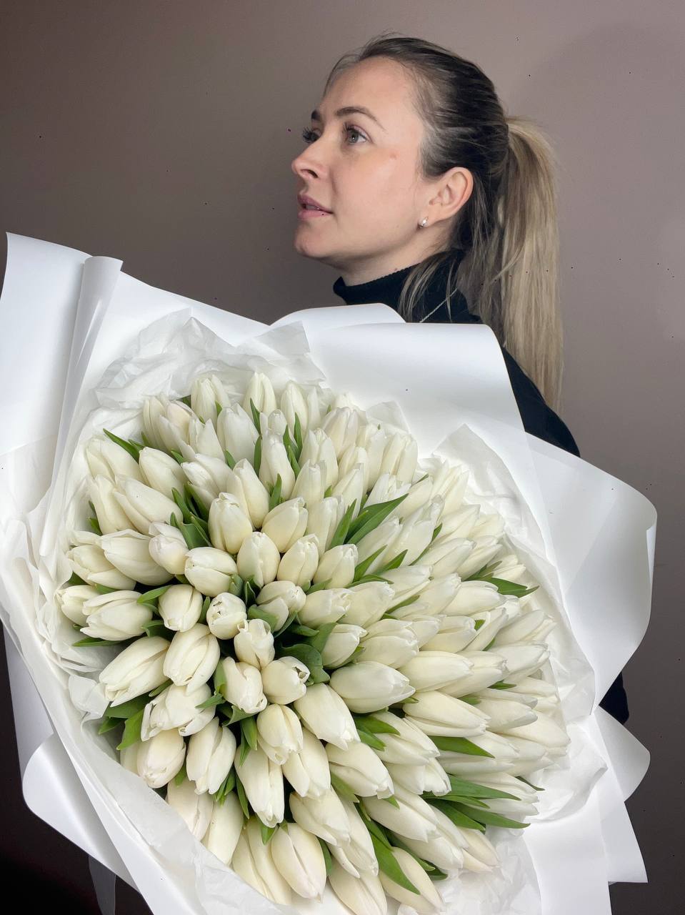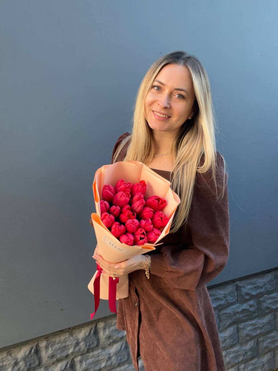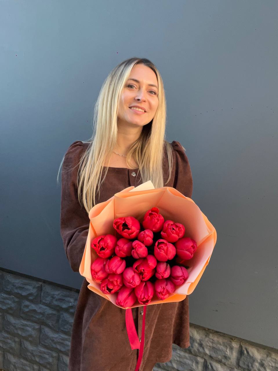 Тридцать семь тюльпанов создают яркое цветовое пятно в любом интерьере. Крафтовая упаковка оставляет композицию открытой и подчёркивает графику стеблей. Букет выглядит свободно и современно.