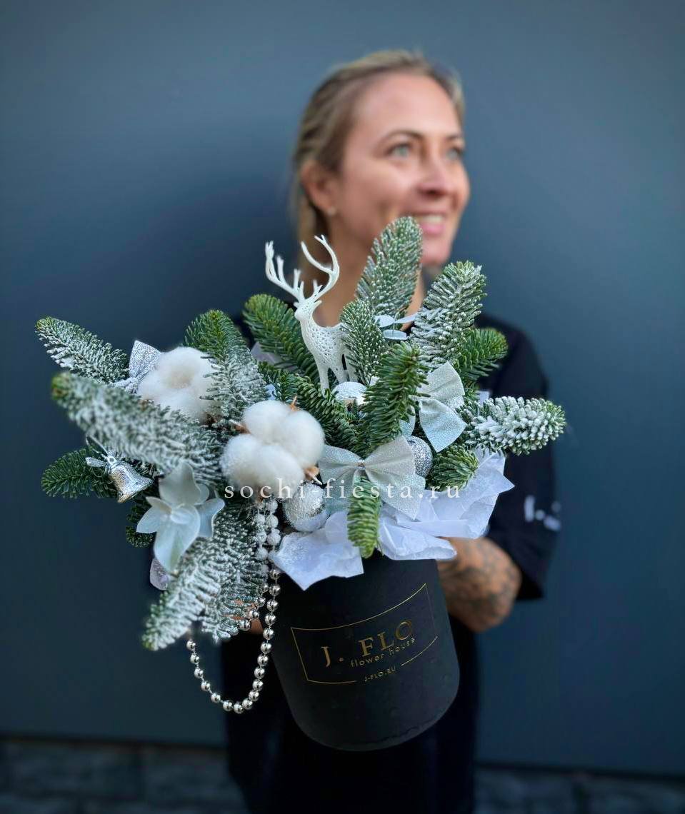 Компактная композиция в белом цилиндре с ветвями нобилиса и праздничными украшениями. Сдержанная цветовая гамма и аккуратная форма подходят для современного интерьера или рабочего стола.