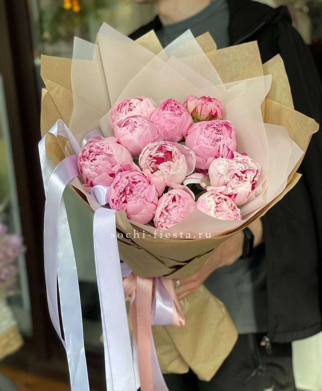 11 розовых пионов, лента, крафт.