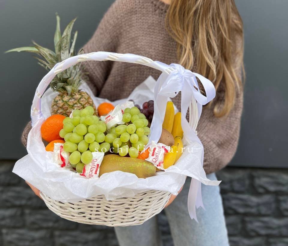 фруктовая композиция в корзине из винограда, бананов, яблок, мандарин, киви, ананаса и Raffaello