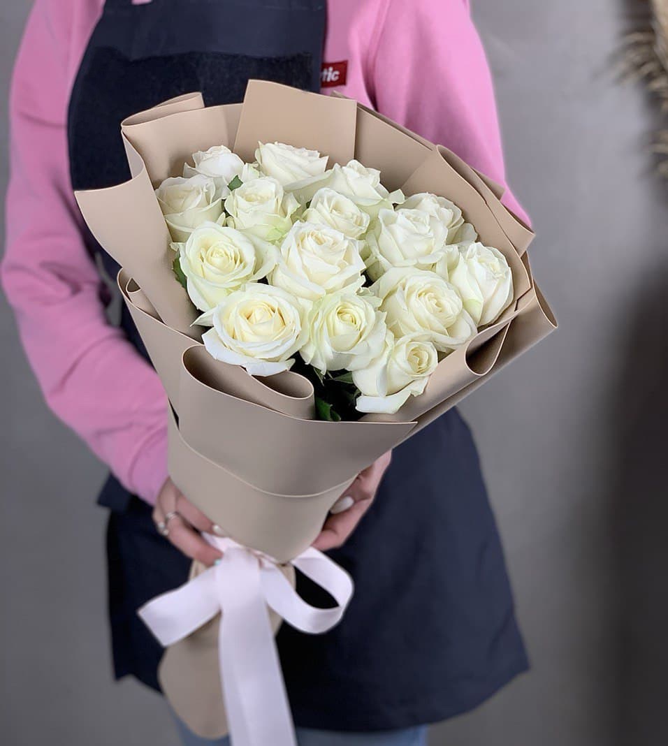 Пятнадцать белых роз в упаковке кофейного оттенка создают спокойное сочетание света и теплой глубины. Лаконичная форма букета удобна для вручения и дальнейшего размещения.