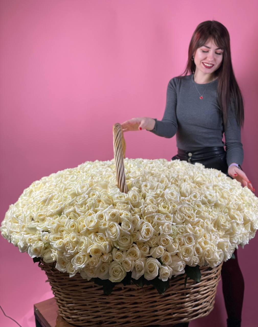 Тридцать пять белых бутонов образуют плотный монохромный ансамбль. Классическая форма и чистота оттенка позволяют букету звучать самодостаточно в любом интерьере.