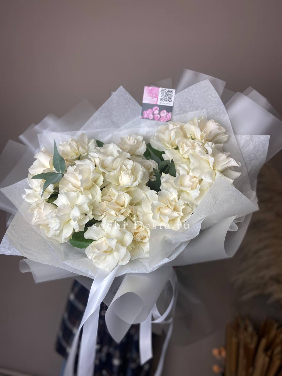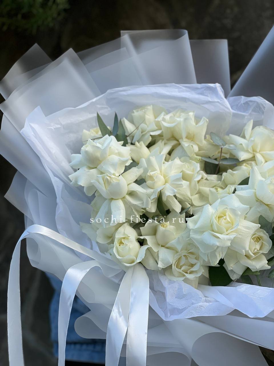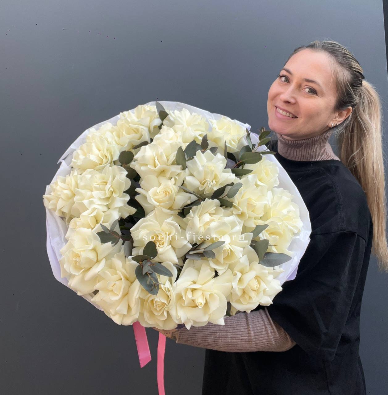 Тридцать семь белых французских роз собраны в круглый бокс с ветками эвкалипта. Плотная укладка бутонов создает объемную композицию, где каждый цветок виден и держит форму. Безупречное решение для яркого события.
