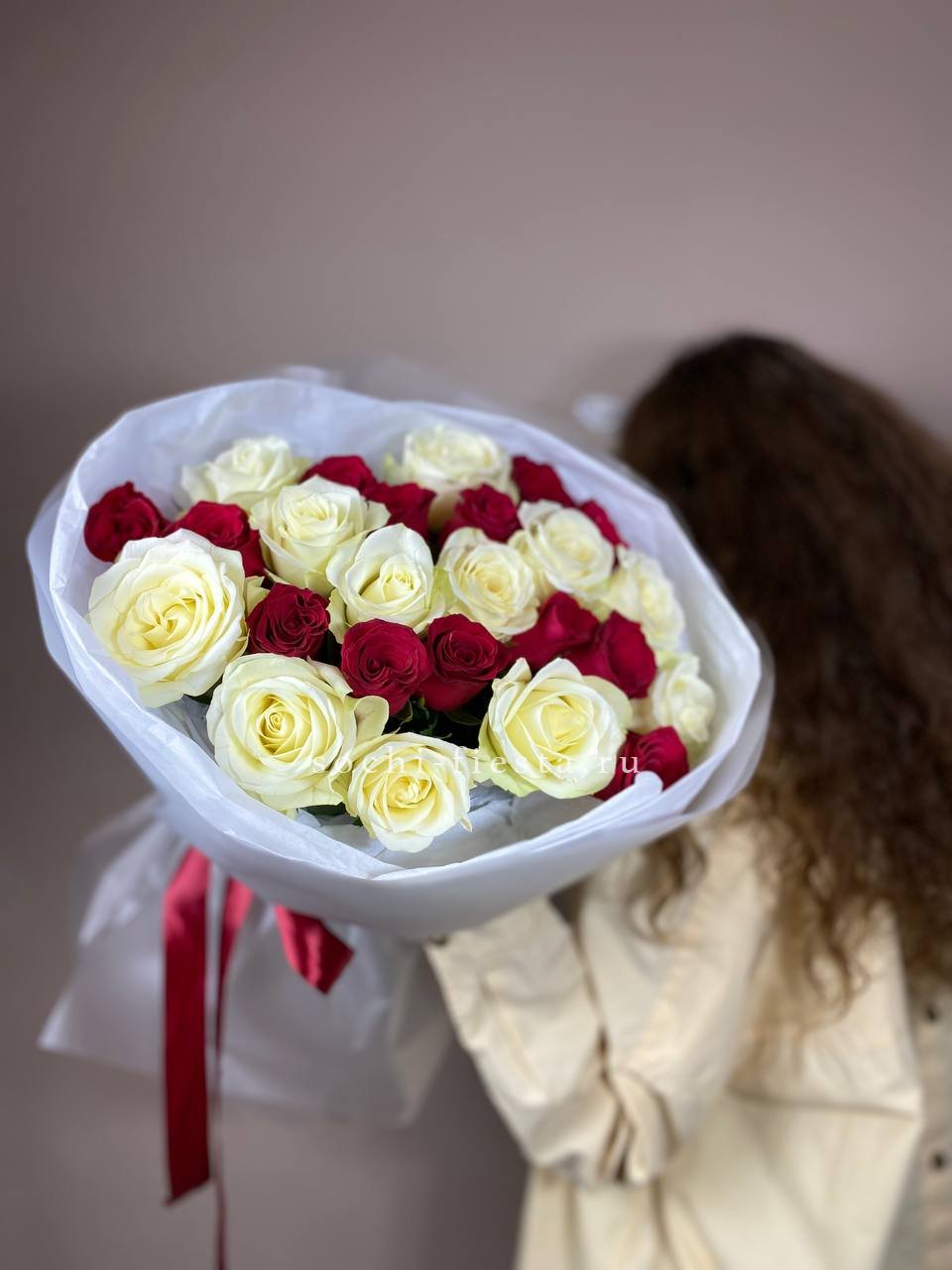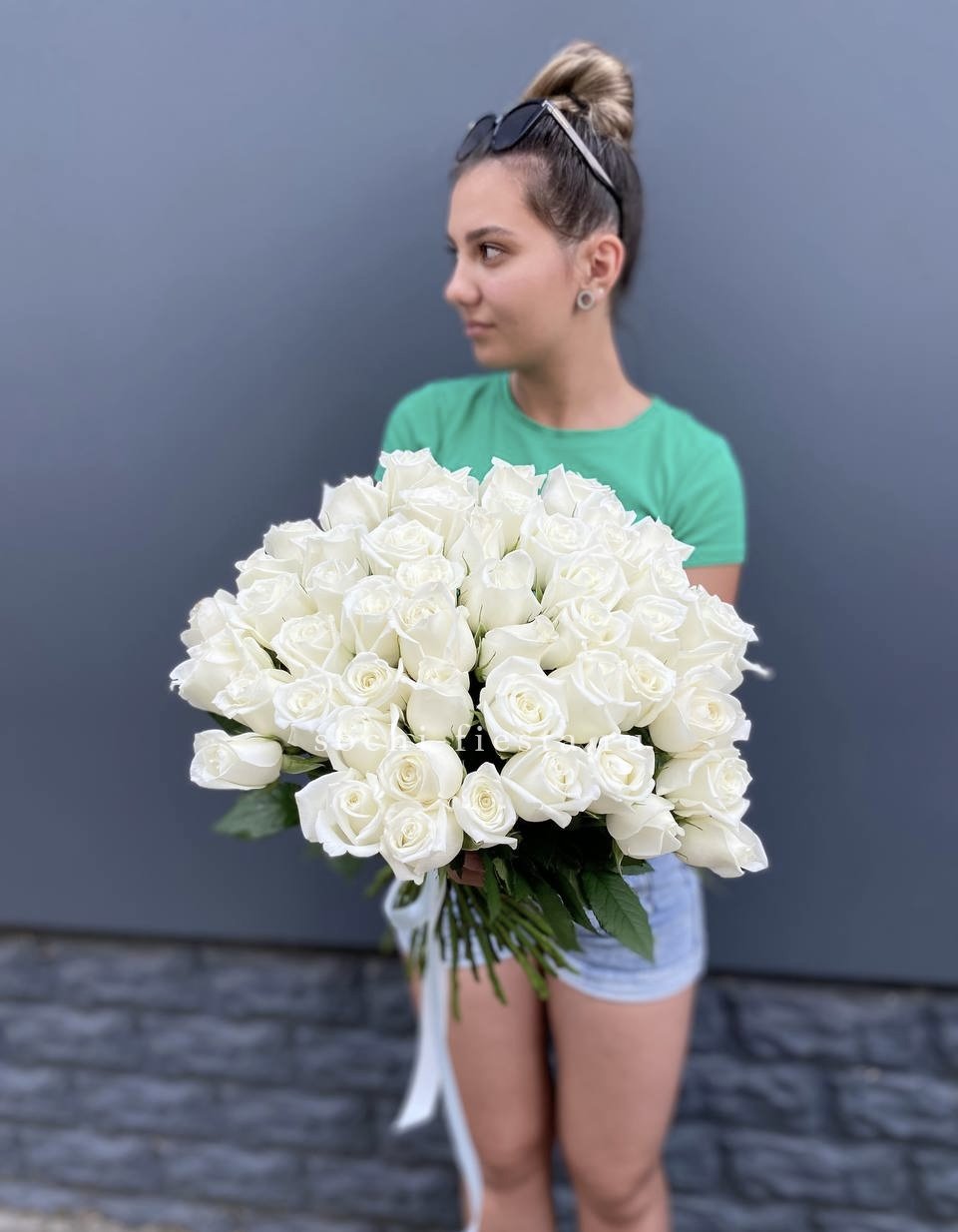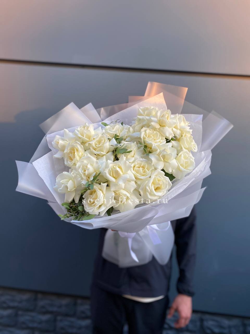 Пятнадцать белых роз в тонкой дизайнерской упаковке создают ощущение лёгкости и чистоты. Матовая текстура бумаги и мягкие складки подчёркивают форму каждого бутона. Композиция выглядит свежо и современно.