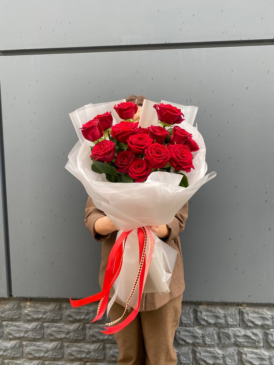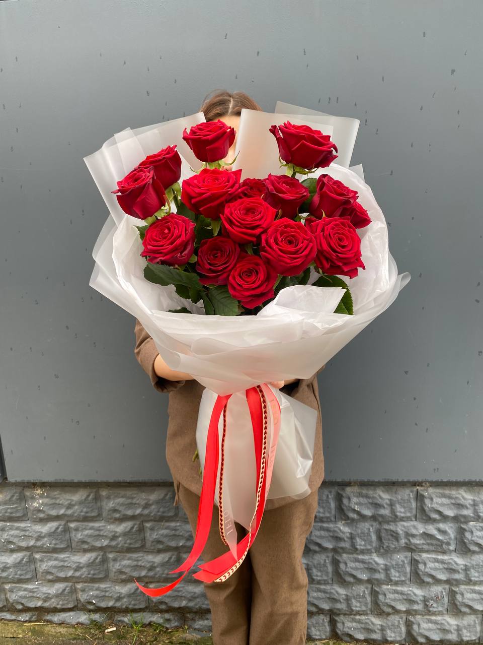 Тридцать пять алых роз собраны в букет с чёткими линиями и выверенным силуэтом. Классическая форма и насыщенный оттенок лепестков делают композицию универсальной для любого повода.