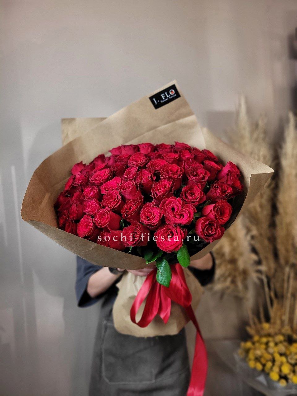 Красный монохром из пятидесяти одной розы притягивает взгляд своей насыщенностью. Крупная композиция заполняет пространство и создает яркое визуальное впечатление.