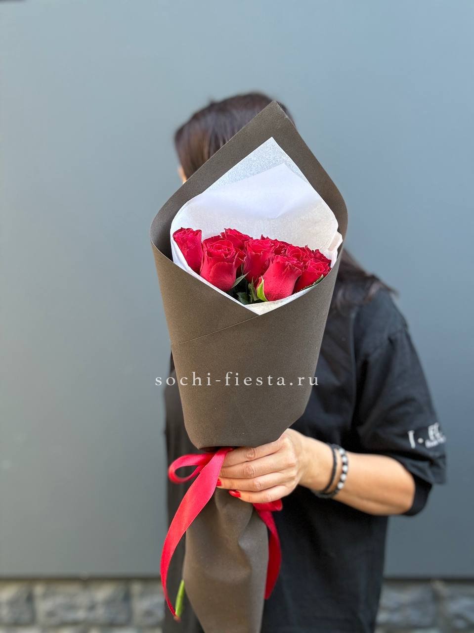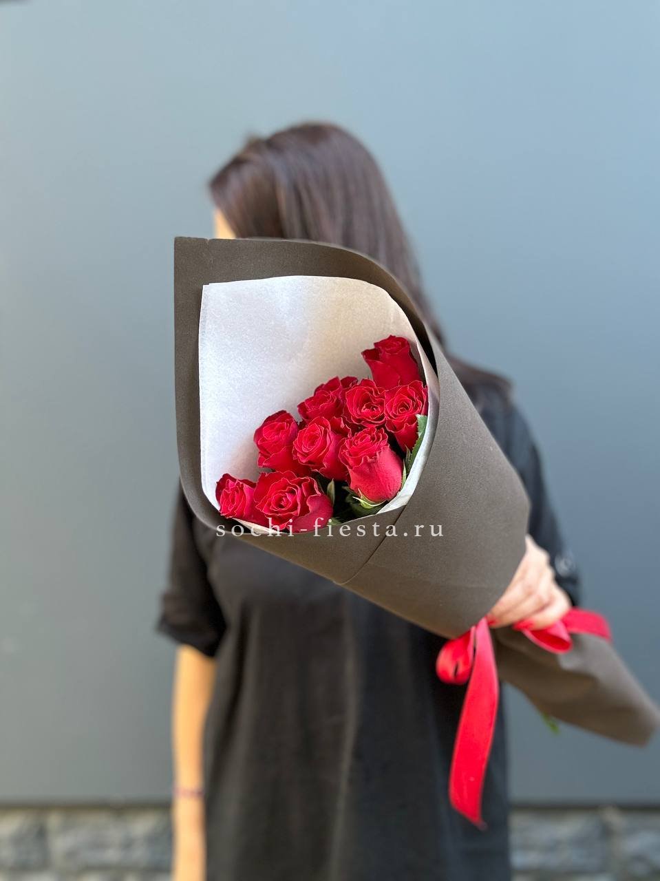 Девять бутонов насыщенного алого оттенка в лаконичной матовой обёртке. Каждый цветок раскрыт в полную силу, образуя плотную округлую форму с выразительным силуэтом.
