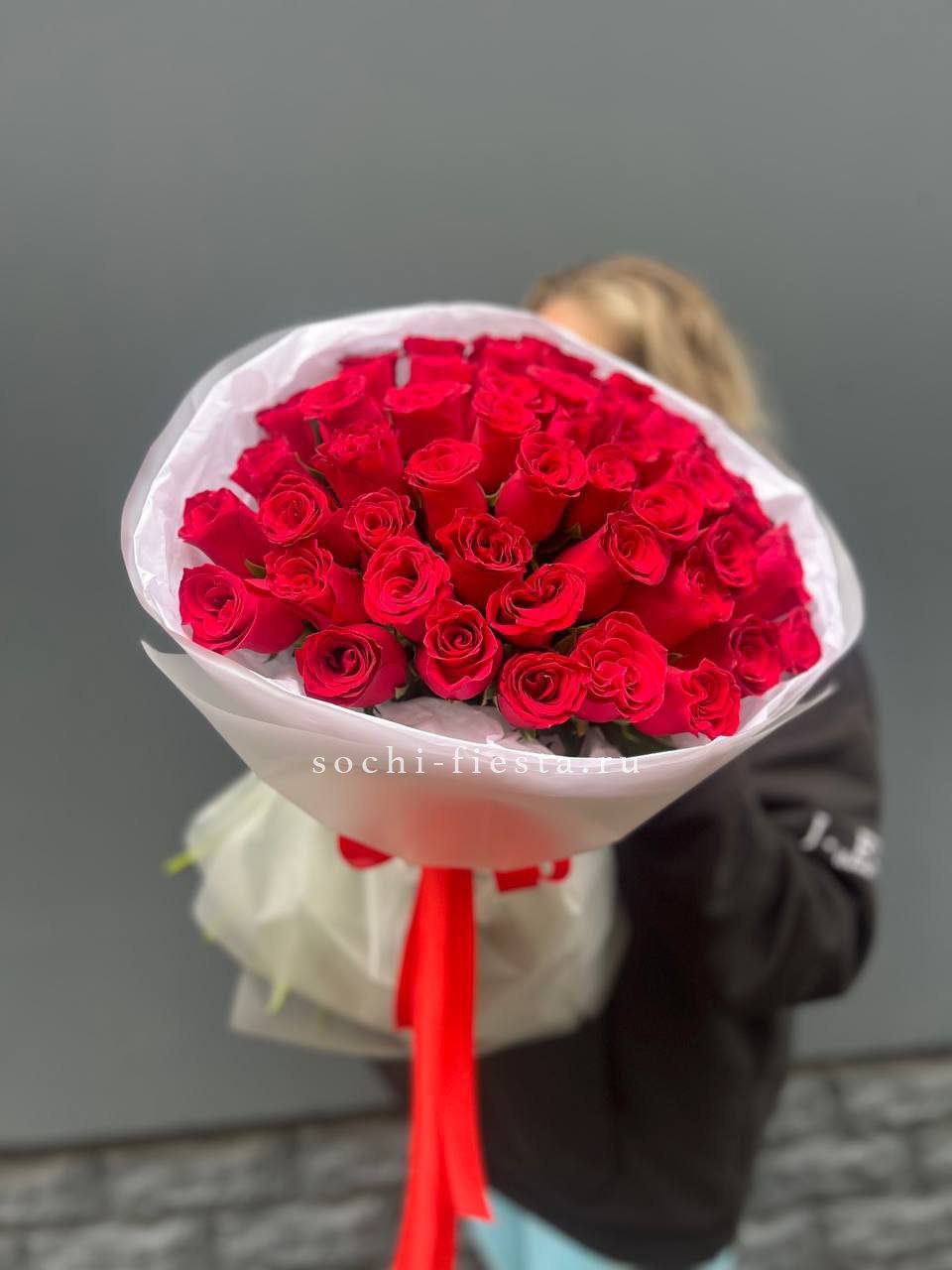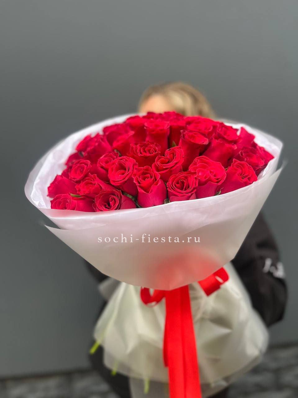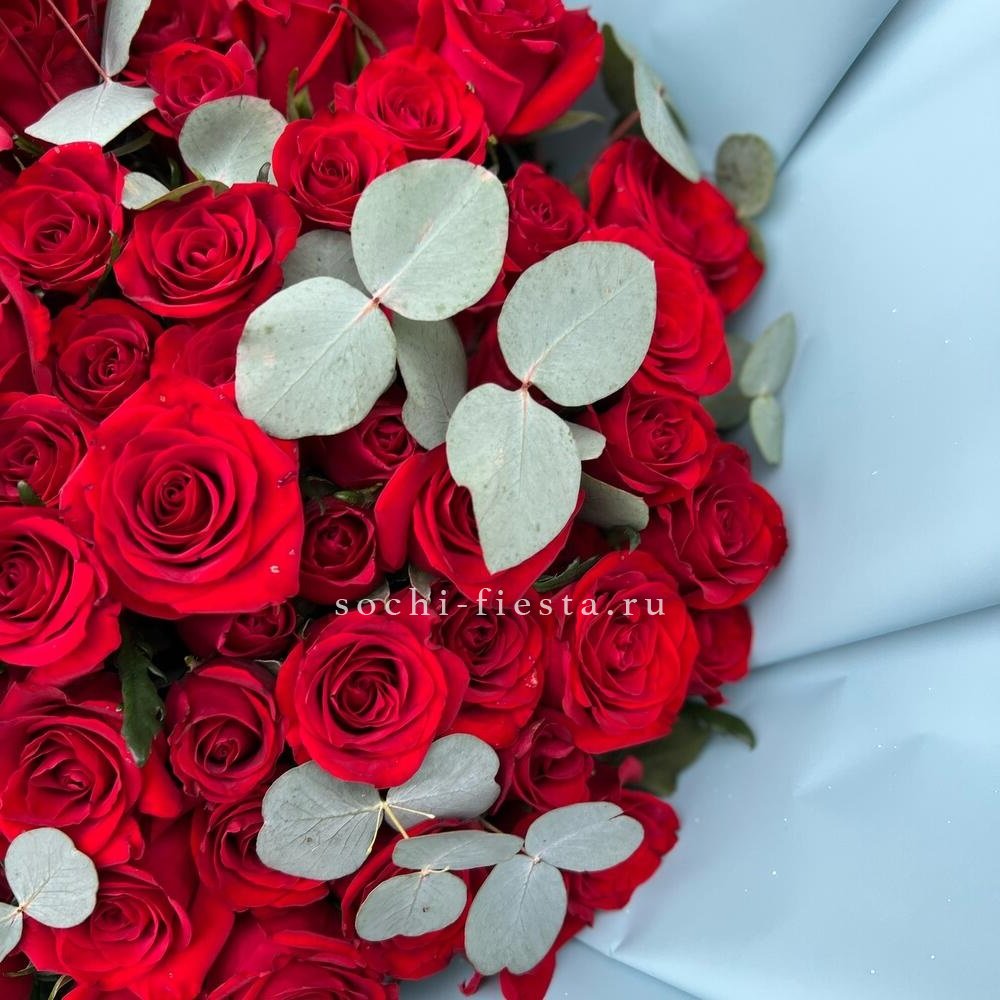 Сто одна голландская роза образует монументальную композицию. Красные бутоны выстраиваются в плотный объем, который невозможно не заметить и сложно забыть.