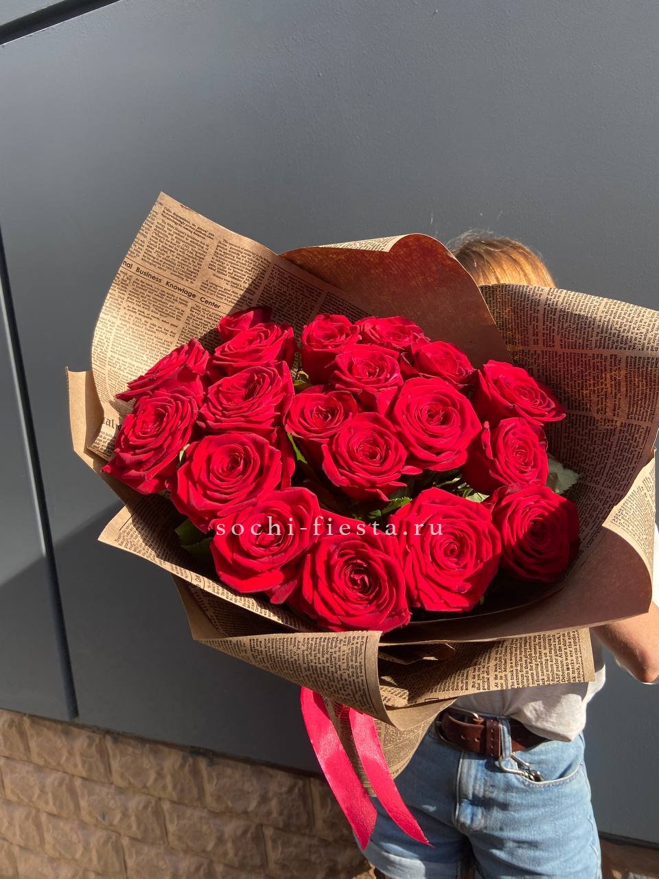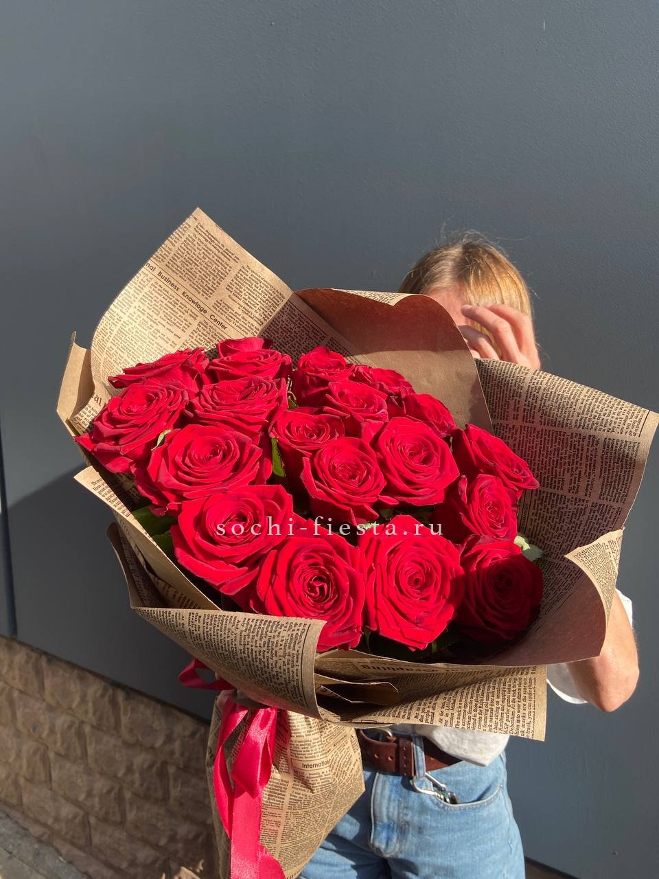 красные розы, лента, крафт.