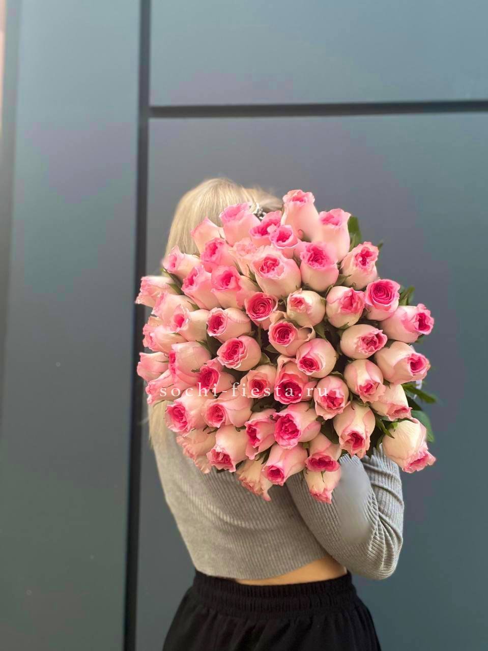 Пятьдесят один бутон с двухцветным переходом от белого края к розовой середине. Пионовидная форма создаёт пышную текстуру и глубину. Лента фиксирует композицию без лишних деталей.