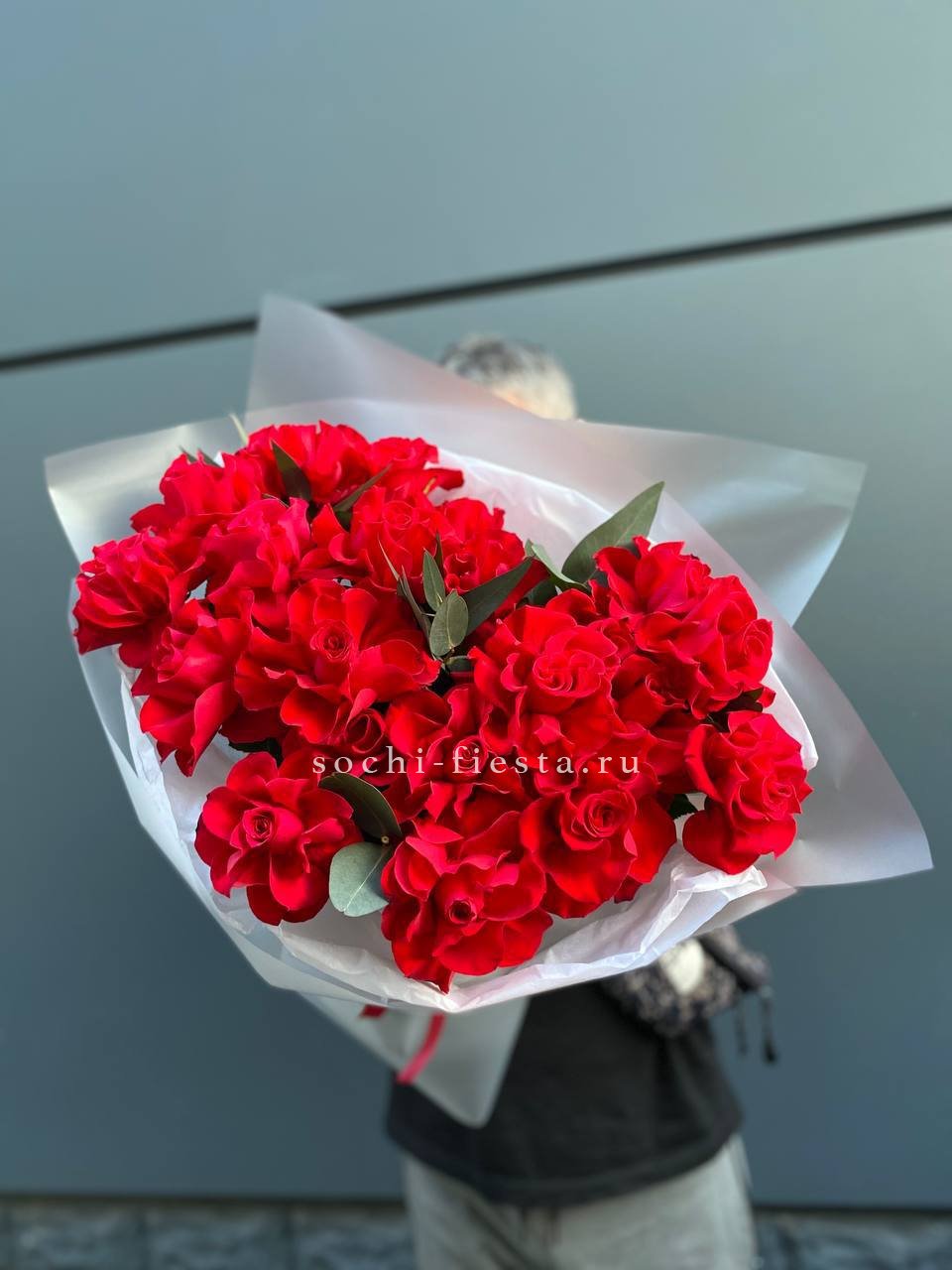 Пять французских роз с вывернутыми лепестками раскрываются широко и создают эффект лёгкой небрежности. Эвкалипт поддерживает форму и добавляет свежести белому цвету.