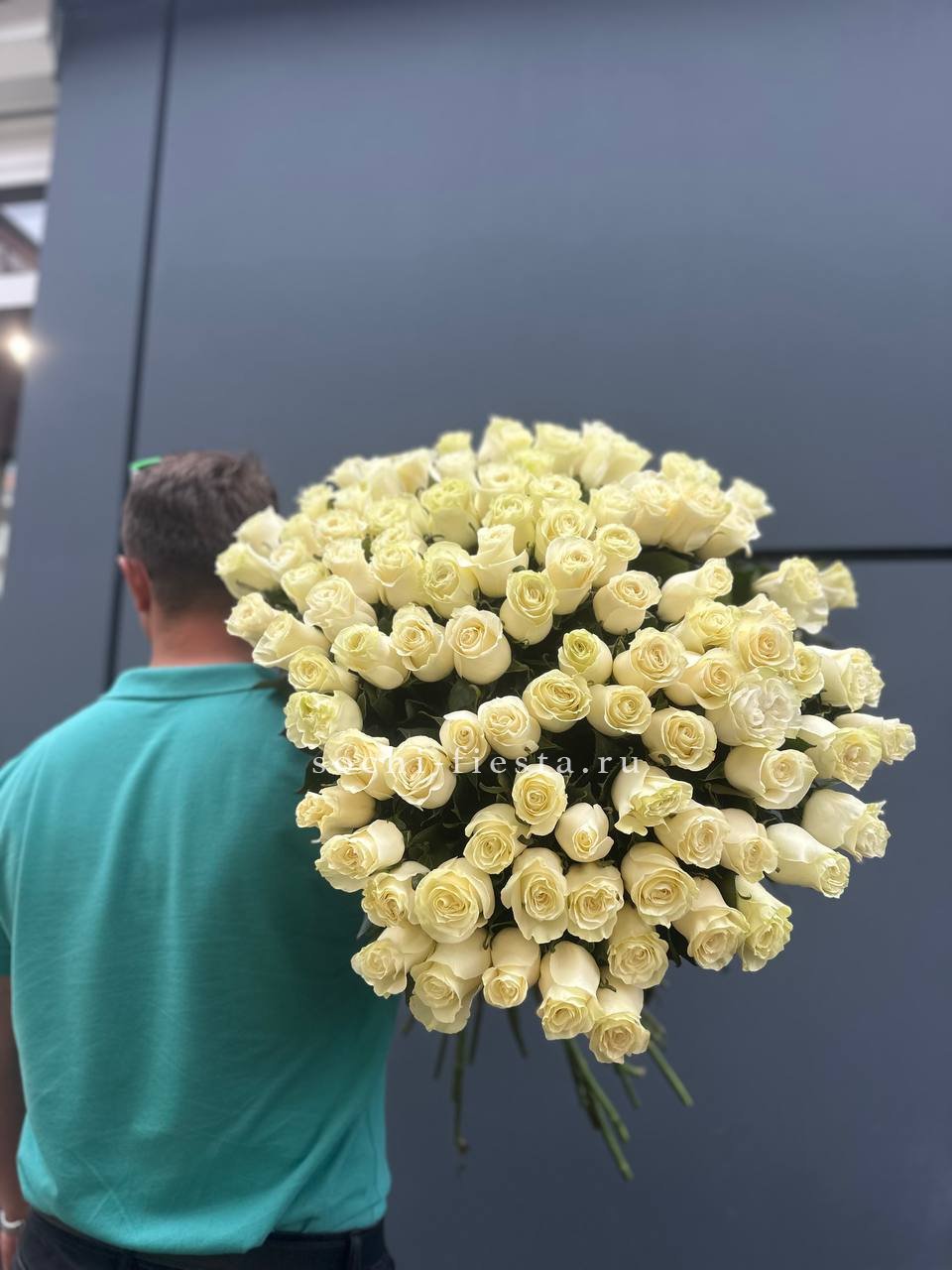 Сто одна белоснежная роза собрана в монументальный букет классической формы. Высокие стебли образуют графичный силуэт, а плотное расположение бутонов создаёт впечатляющий объём. Лаконичная лента завершает композицию.