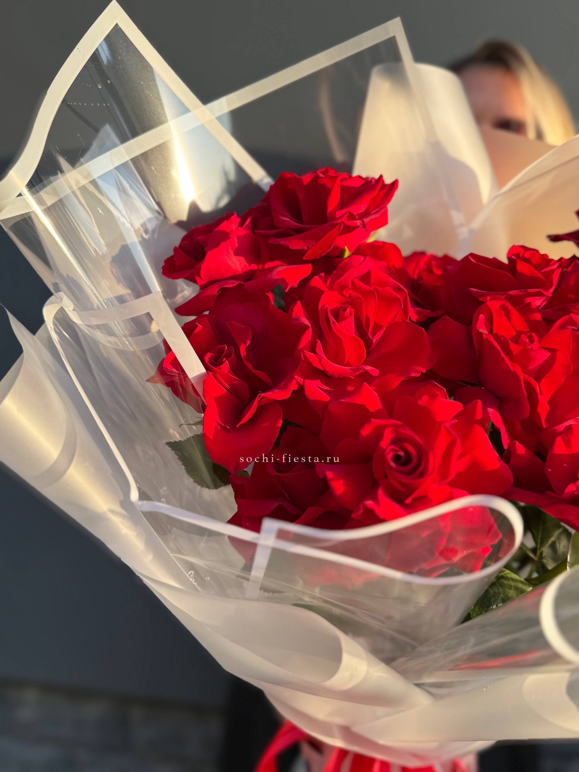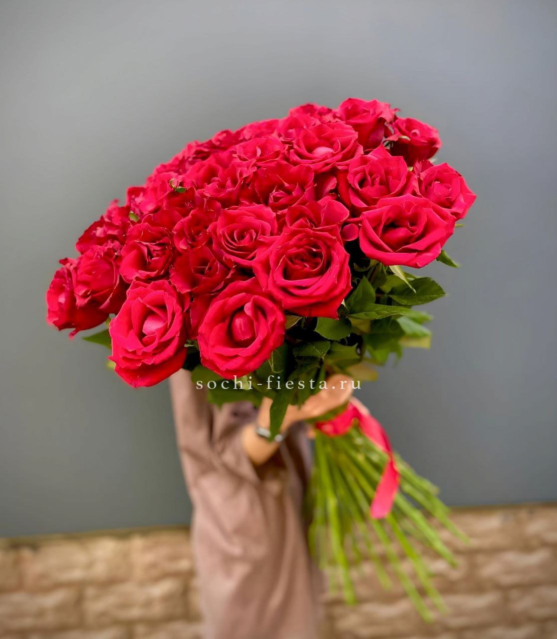 Глубокий красный тон и бархатистая фактура раскрывающихся бутонов создают насыщенное цветовое пятно. Голландские розы удерживают свежесть и форму долгое время.