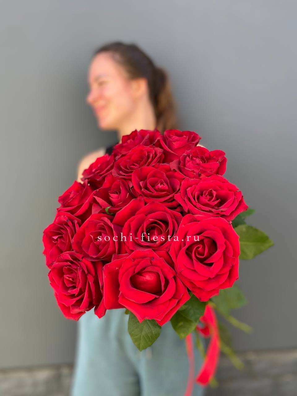 Пятнадцать алых бутонов собраны в плотный монохромный силуэт и перевязаны лентой. Классическая форма букета держит направление и ритм без лишних деталей.