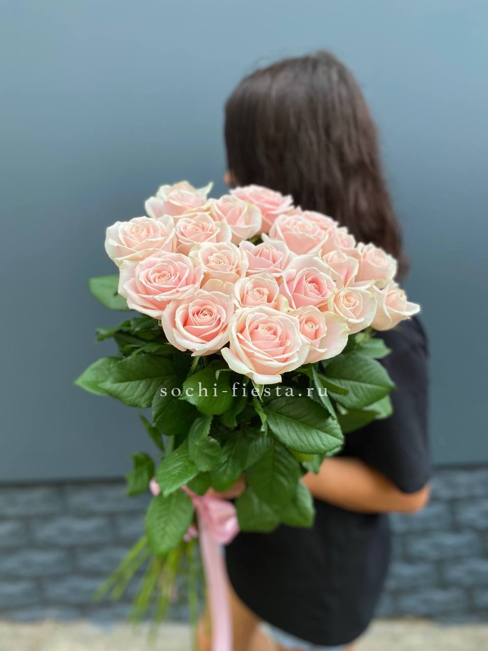 Двадцать пять белых бутонов раскрываются слоями и создают воздушную фактуру с глубиной. Голландские розы удерживают свежесть и сохраняют структуру долгое время.
