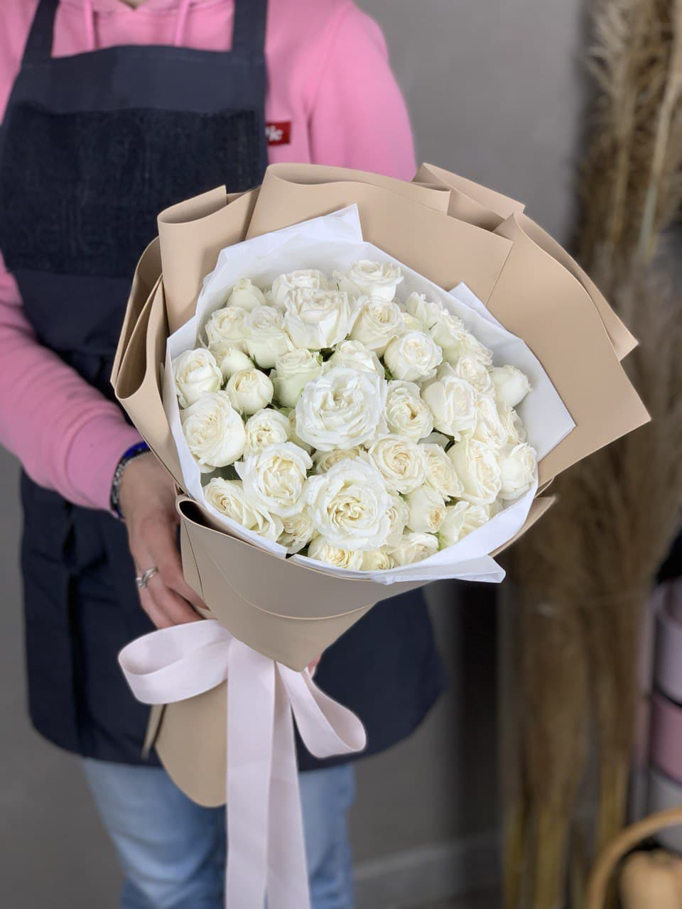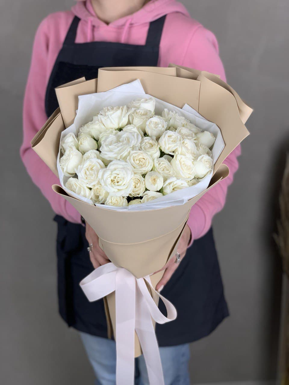 25 пионовидные кустовые розы,  хлопок, лента, дизайнерская упаковка.
