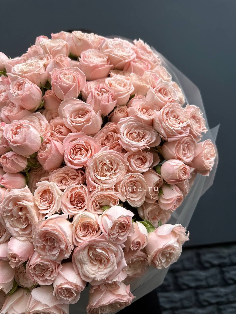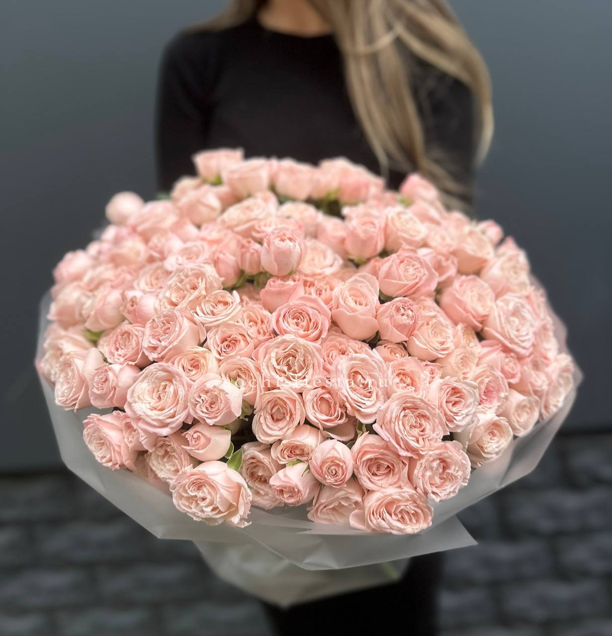Пятьдесят один бутон сорта Бомбастик с густомахровыми лепестками кремового оттенка. Плотная сборка создает впечатляющий объем и заполняет пространство. Монобукет для тех моментов, когда важен масштаб.