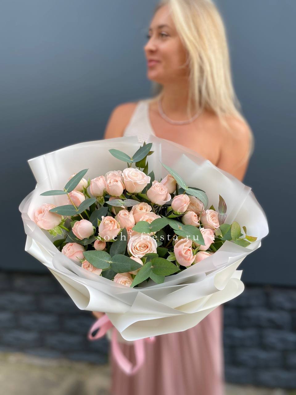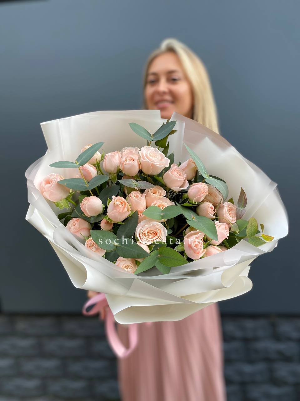 кустовые розы, лента, дизайнерская упаковка.