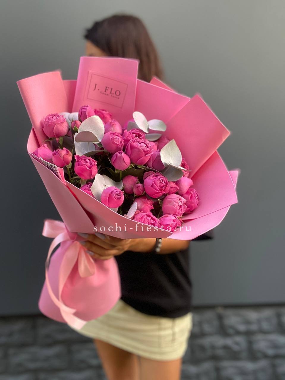 Пятнадцать бутонов Мисти Бабблс с лавандовым отливом и припыленной текстурой лепестков. Компактная форма и сдержанная гамма создают ощущение утренней свежести.