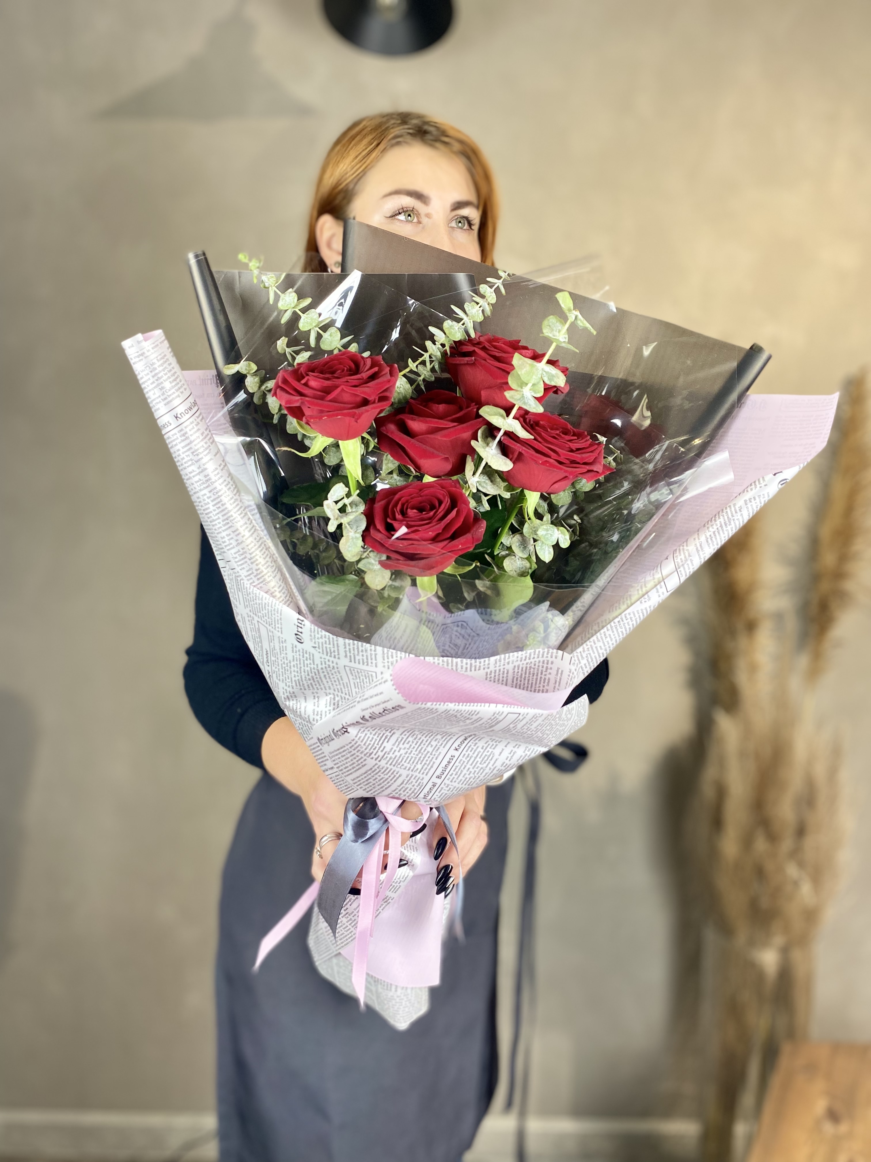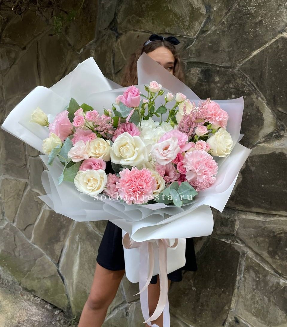 диантусы, розы, эустома, гортензия, эвкалипт, вспомогательные цветы, лента, корейская пленка.