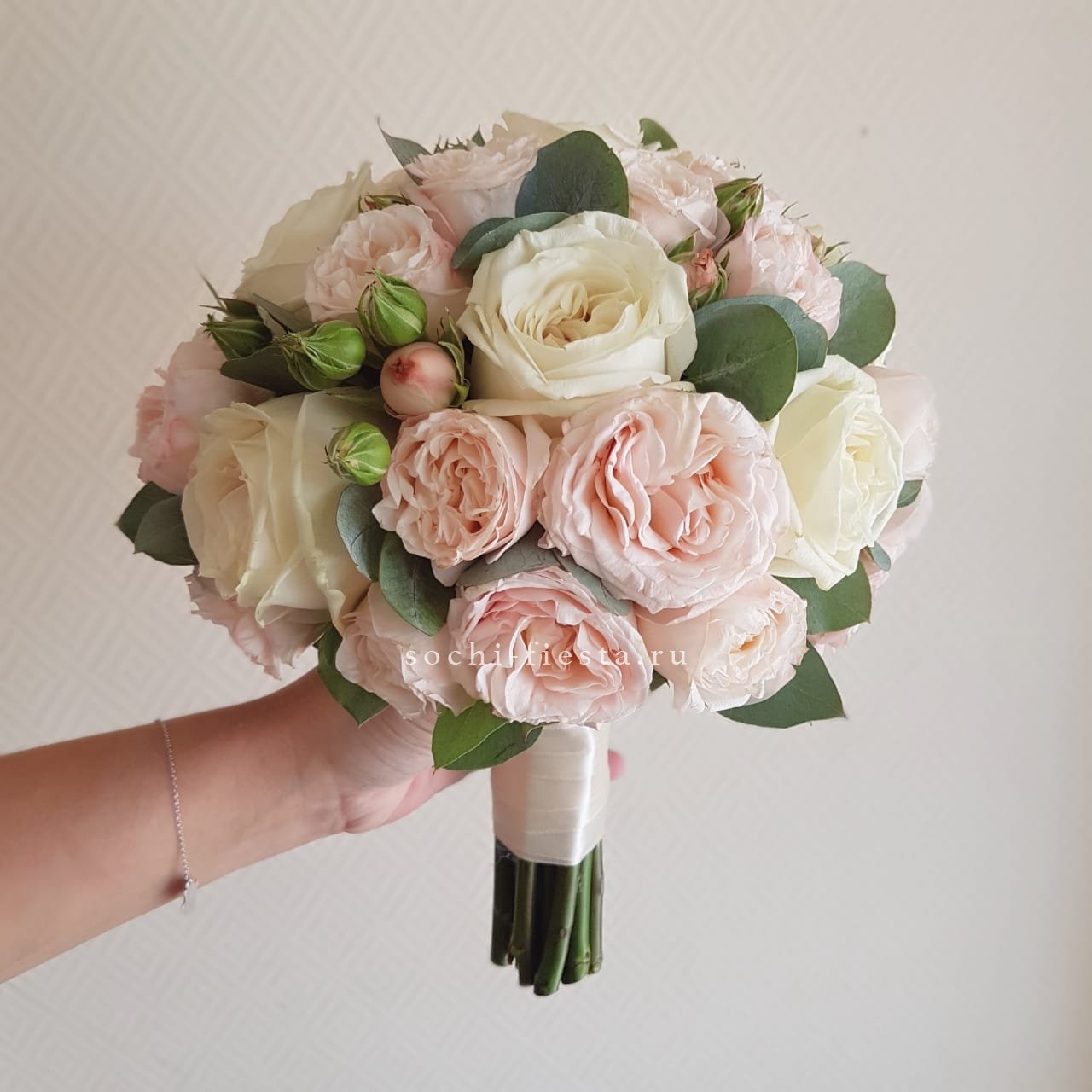 Свадебная композиция из роз эустомы и сезонных акцентов держит форму и остается свежей долгое время. Эвкалипт завершает структуру букета добавляя практичности торжественному образу.