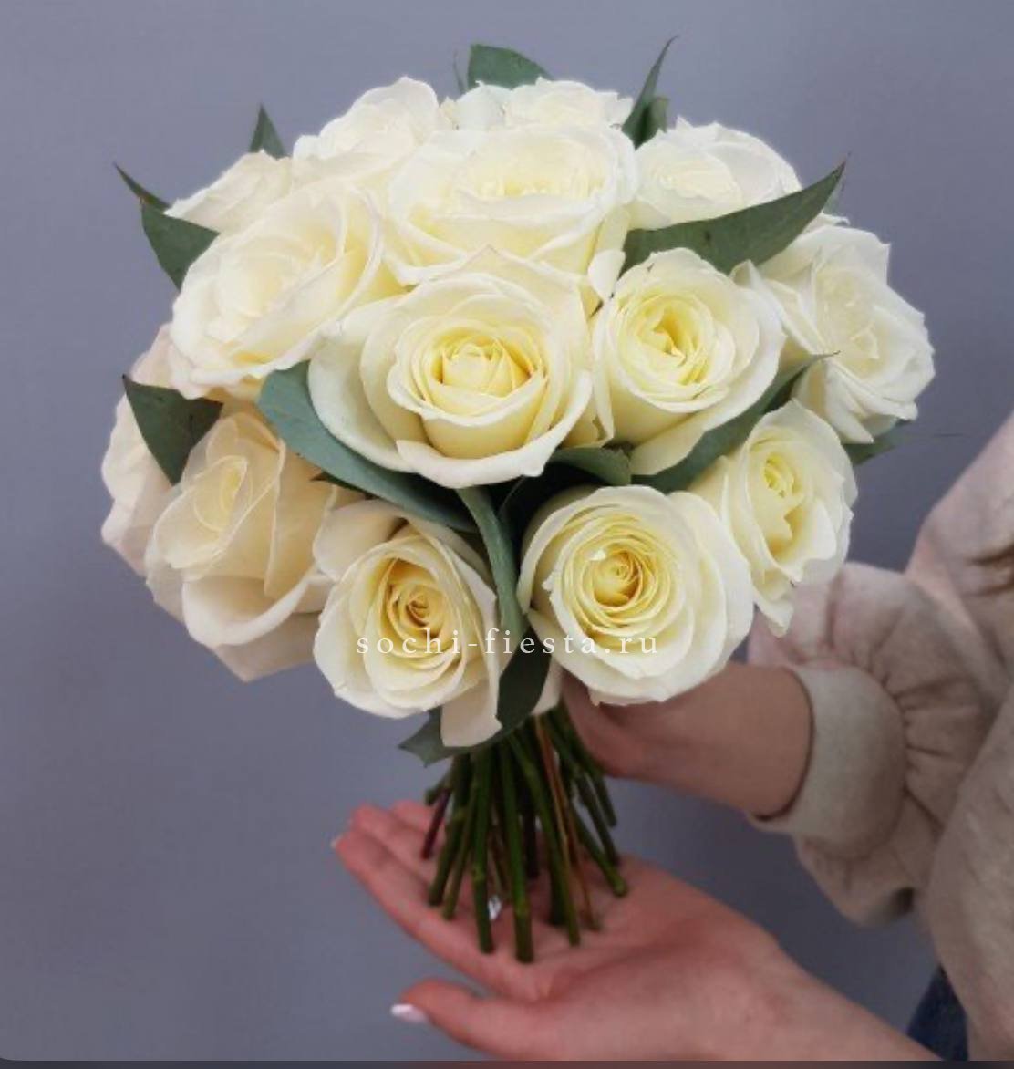 эустома, белые одноголовые розы, сезонный цветок (фрезия / альстромерия / эустома), эвкалипт, лента.